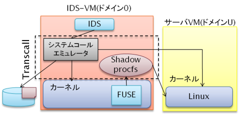 TranscallはオフロードしたIDSに修正を加えることなく動作させられるようにする実行環境であるVM Shadowを提供します。 Transcallはシステムコールのエミュレーションを行うことで、IDS にオフロード元の仮想マシンのOSの情報を返します。 また、proc ファイルシステムも含め、オフロード元と同一のファイルシステムを提供します。 ただし、IDS の実行ファイル等については安全のためにオフロード先の仮想マシンのファイルを提供します。 現在の実装では、VM Shadow 内でchkrootkit やTripwire などを動作させることが可能です。